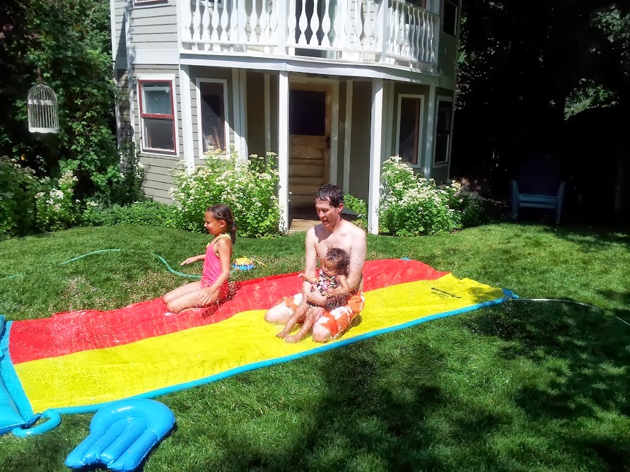 Steve taking Layla down the slip-n-slide while racing Brinlee.